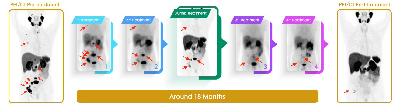 疗程通常为四至六个周期,每个周期相隔六至十五周。接受此治疗前,进行Ga-68-DOTA结合肽 及F-18FDG正电子/电脑扫描是必须的。核子医学专科医生会根据肿瘤及转移病灶的追踪剂摄取量及分布 来评估治疗的可行性及处方鑥-177 DOTA治疗剂量。