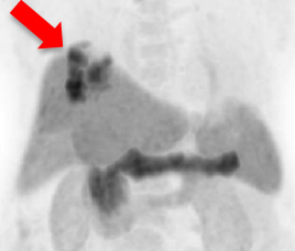 氟18 PSMA正电子/电脑双融扫描显示大部分病灶於鑥177 PSMA放射核素治疗後可见改善(红色箭头所示)。